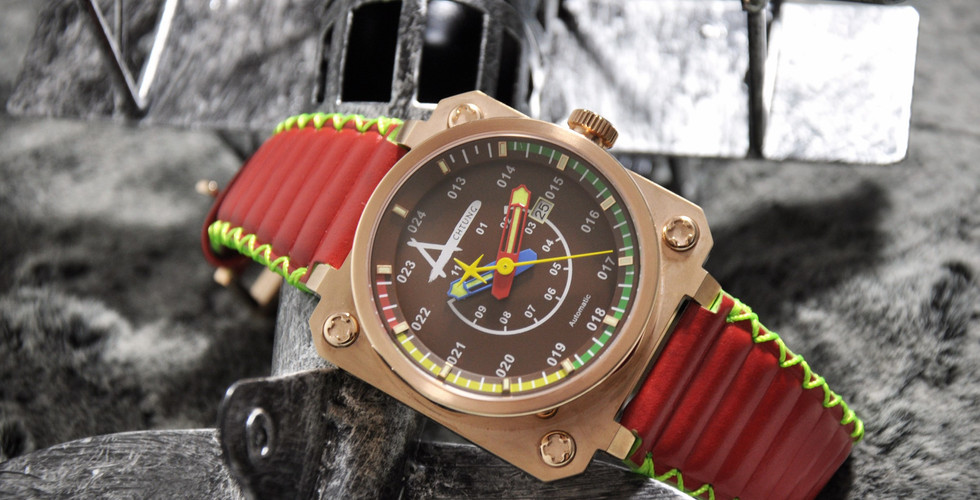 品牌属于微品牌,产量不多,或许也因此,品牌在设计上更认真。 Aviatorē飞行员腕表有什么特色?表盘上有绿色、黄色及红色的空速指示器标尺;3点钟位置为日期显示窗。另一打破常规的设计是,表壳由两个组件组成—一个方形底座和一个在顶部的圆锥体坐,所以看起来较有立体感。