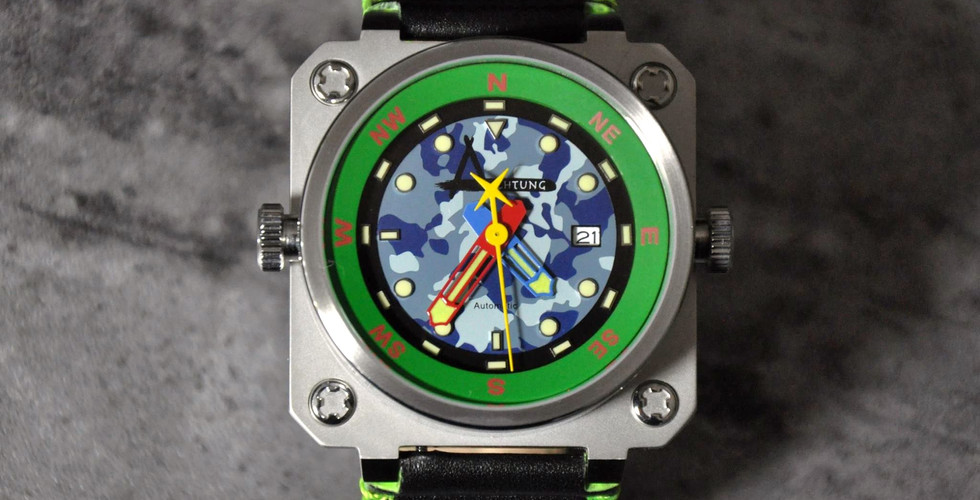 表盘为缤纷的迷彩设计,3点钟位置为日期显示窗,多附一个表观设计以调整表盘上的指南针。(售价660美元)